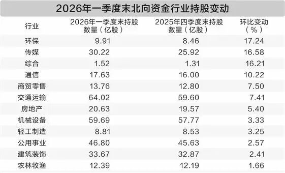 另外,公用事迹、轻工制造、机械建造等行业均获北向资金环比加仓。