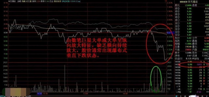 试探型下落顾名想义是操盘手为了试探下方压力、测试筹码壮健度并勾引商场眼球为次日操盘提供条目的一种异动特征。试探型下落量能结构是由数笔巨量大单或大单呈纵向放大特征,零落横向不时放大,股价泛泛出现瀑布式垂直下落情景。