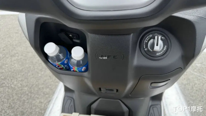 储物空间是150SC-F的一大上风,前边有一个怒放式的储物格,可以放两瓶水,还有一个闭塞式的储物盒,浅近铁心机、证件、钥匙,中间有折叠式挂钩。另外,在还简略看到NFC的感应区域。