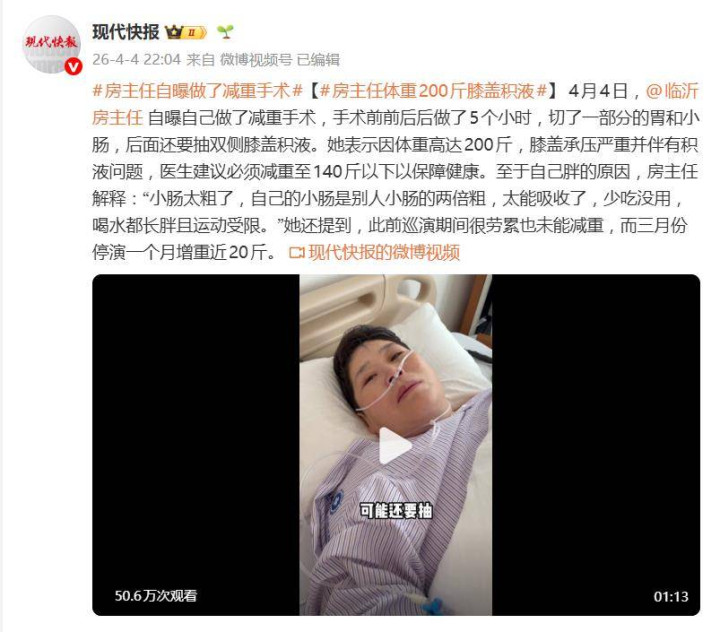 据4月4日晚间报说念,脱口秀演员房东任的一则自曝,平直让“喝水齐长胖”这句打妙语变成了扎心的医学形色。她表露我方刚刚作念了一场长达5小时的减重手术,切掉了一部分胃和小肠,而原因竟是她的小肠“天禀异禀”——太能领受了。