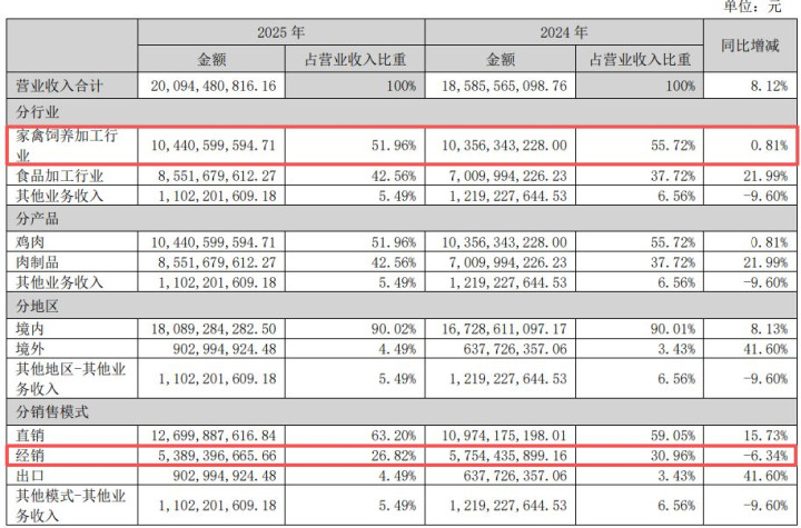 年报还清晰,圣农发展家禽饲养加工业务期内的营收占比从前年的55.72%回落至51.96%,如故占比最大的业务,该业务期内完毕营收104.41亿元,同比增长0.81%,但该板块毛利率同比下落0.14个百分点至5.56%;占营收26.82%的经销形状,2025年完毕营收53.89亿元,同比下落6.34%,该形状毛利率为5.08%,同比下落1.31个百分点。