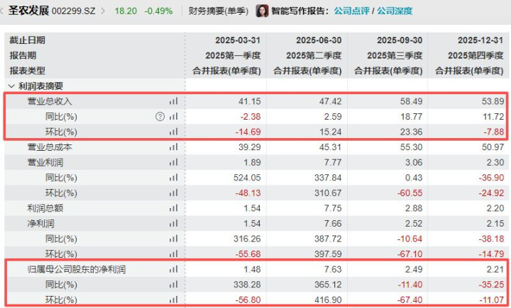 分季度看,圣农发展2025年四季度完毕营收53.89亿元,同比增长11.72%,环比下滑7.88%;2025年四季度完毕归母净利润2.21亿元,同比下滑35.25%,环比下滑11.07%。