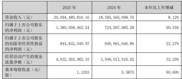 4月12日晚间,圣农发展(SZ002299,股价18.20元,市值226.25亿元)败露2025年年报,公司2025年完毕营收约200.94亿元,同比增长8.12%;完毕包摄于上市公司鞭策的净利润约13.8亿元,同比增长90.55%;完毕扣非净利润约8.45亿元,同比增长22.27%;基本每股收益1.1203元,同比增长90.69%。公司拟向举座鞭策每10股派发现款红利2元(含税),不送红股,不以公积金转增股本。