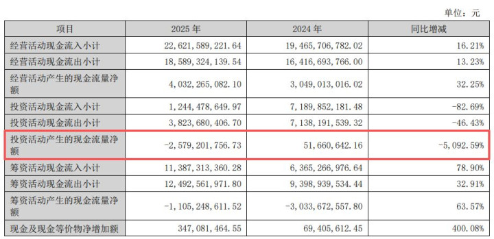 投资现款流同比转负至-25.79亿元