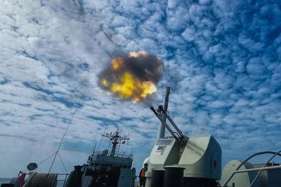 主炮系统快速锁定蓄意跟着射击请示下达炮口炎火喷涌炮弹精确射中海上浮动靶标