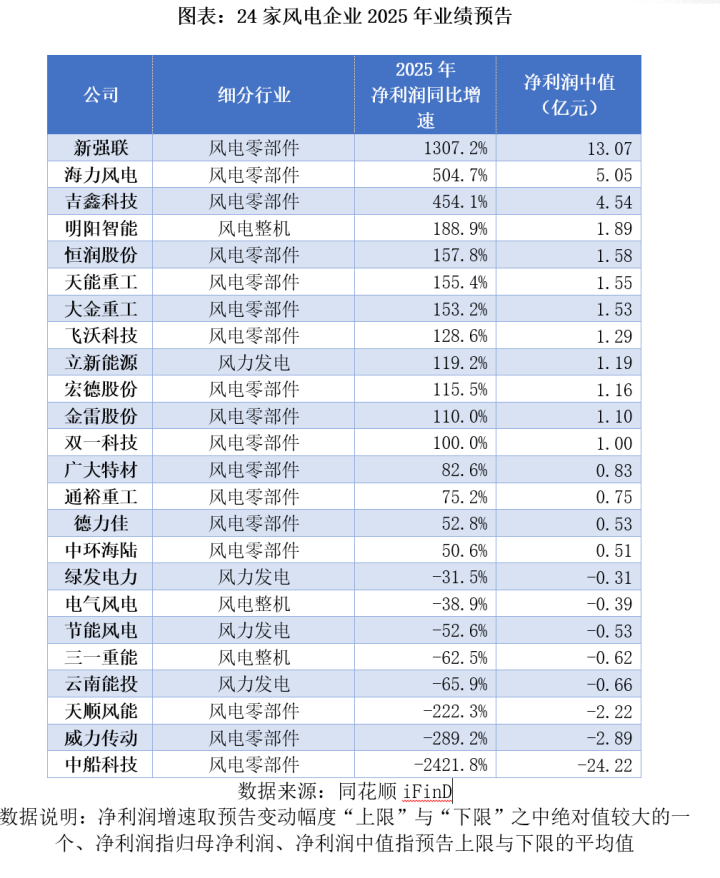 2025年国内风电新增吊装容量达1.3亿千瓦,同比增长49.9%,成为行业盈利高增的中枢驱能源,24家样本企业净利润同比增速中位数达91.31%,66.67%的企业净利润同比增长,其中12家结束翻倍增长。