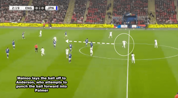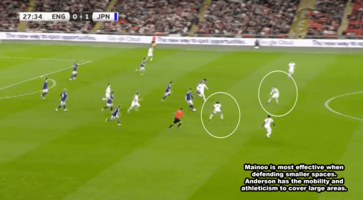 梅诺与安德森搭配时,情况就跟在曼联与卡塞米罗互助一样。梅诺居左,无球情状下会上前逼抢,因为他只擅长看重较小的区域;安德森在偏右位置殿后,厚爱大大皆的看重负务。